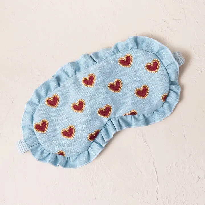 * 100% Cotton front * 100% Polyester Velvet back * Dimensions: 21x10cm (S-M) * Elasticated strap * Filled with 63% Lavender and 37% Polyester * Hand wash only * With cotton drawstring carry bag Finished with a romantic ruffle and pink embroidered love hearts on blue cotton, this design is a playful take on Valentine’s sentiments – perfect for someone you’re sweet on. Featuring delicate embroidery onto a luxurious soft base, this eye mask is filled with sweet lavender to help you drift away into a dreamy night’s sleep.